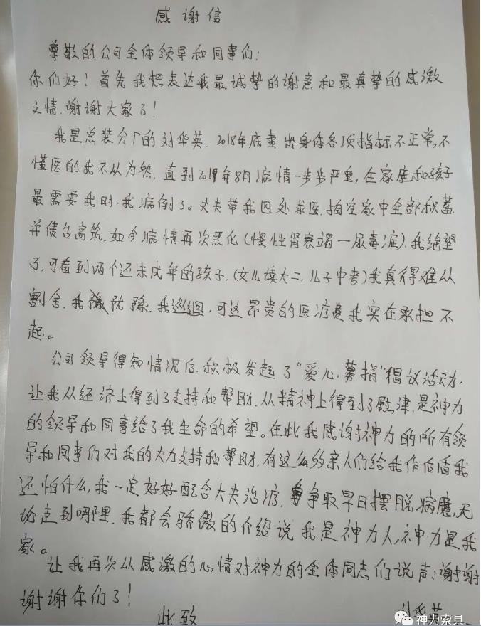 公司领导获悉到职工刘华英患病情况恶化后,为了体现神力索具公司和广大员工乐善好施、扶贫帮困的高尚品德和优良传统,积极组织倡议,倡议中提到:在全公司开展“为刘华英大病救治捐款”活动,帮助她度过难关、走出困境,使她本人及其家庭不再为生活的艰辛而愁苦,不再因病致贫的困境而窘迫,不再为突如其来的不幸而无助。