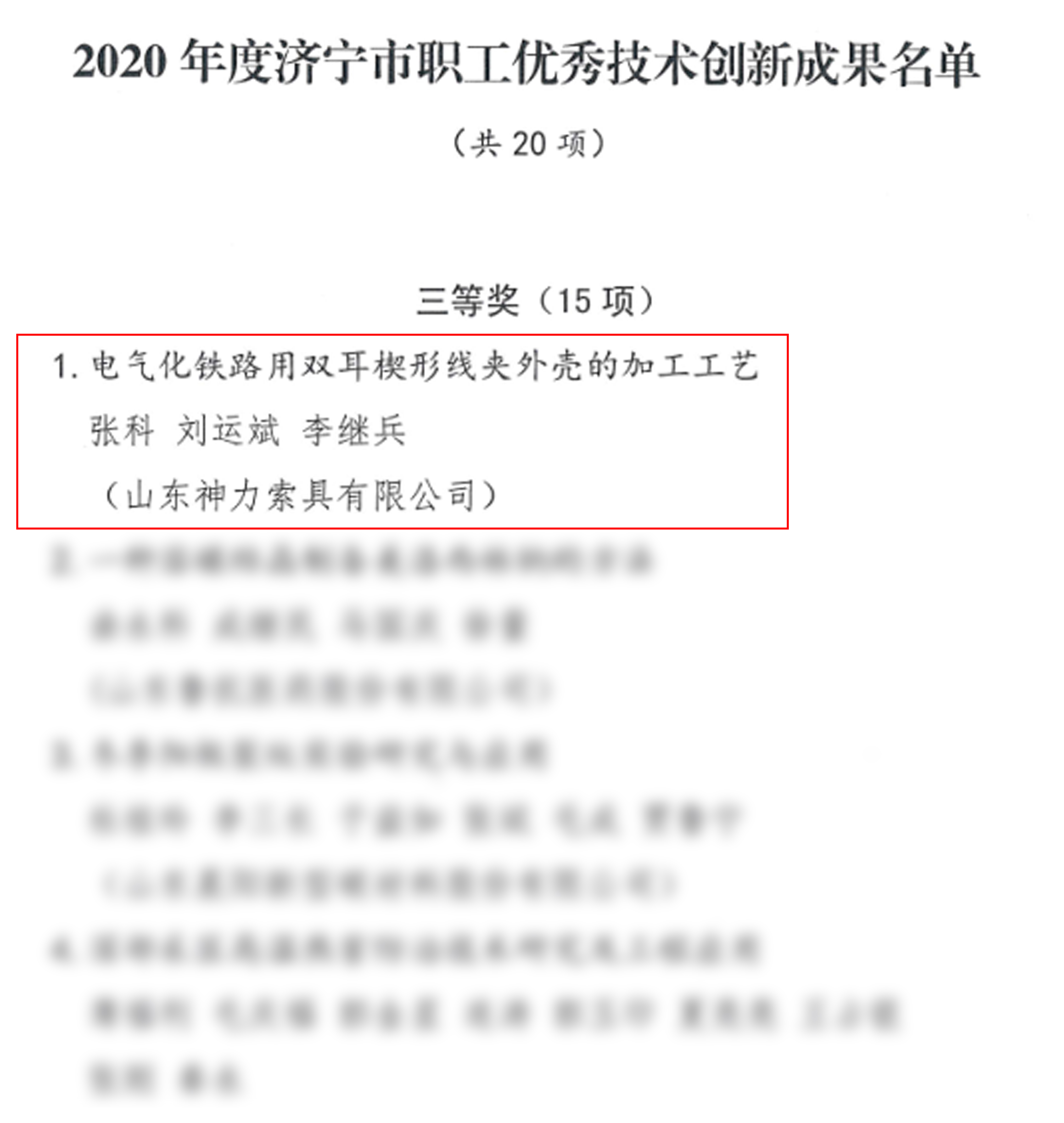 在济宁市职工优秀技术创新成果名单中,我公司创新成果“电气化铁路用双耳锲型线夹外壳的加工工艺”荣膺三等奖。为积极践行新发展理念,弘扬劳模精神、劳动精神、工匠精神,市总工会对创新小组主要成员张科、刘云斌、李继兵各奖励1000元。