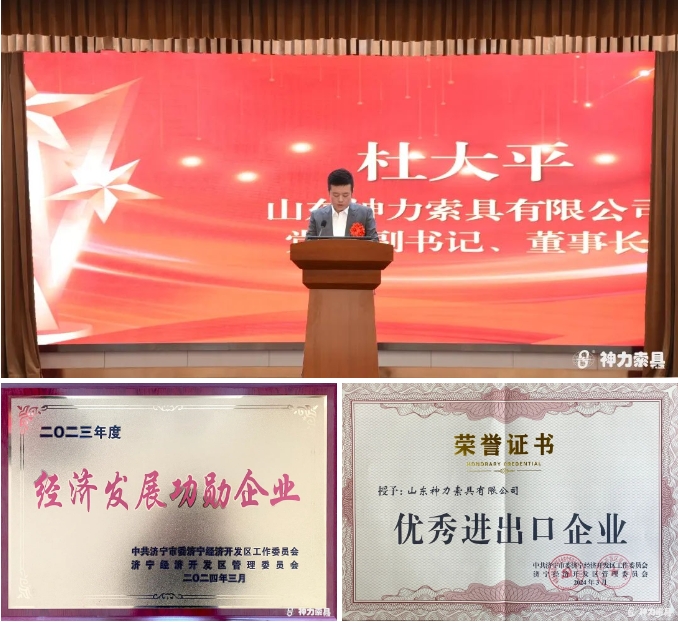 其中,神力索具荣获“经济发展功勋企业”、“优秀进出口企业”及“创新创优企业”共计三项荣誉称号。董事长兼总经理杜大平荣获“经开区功勋企业家”称号。