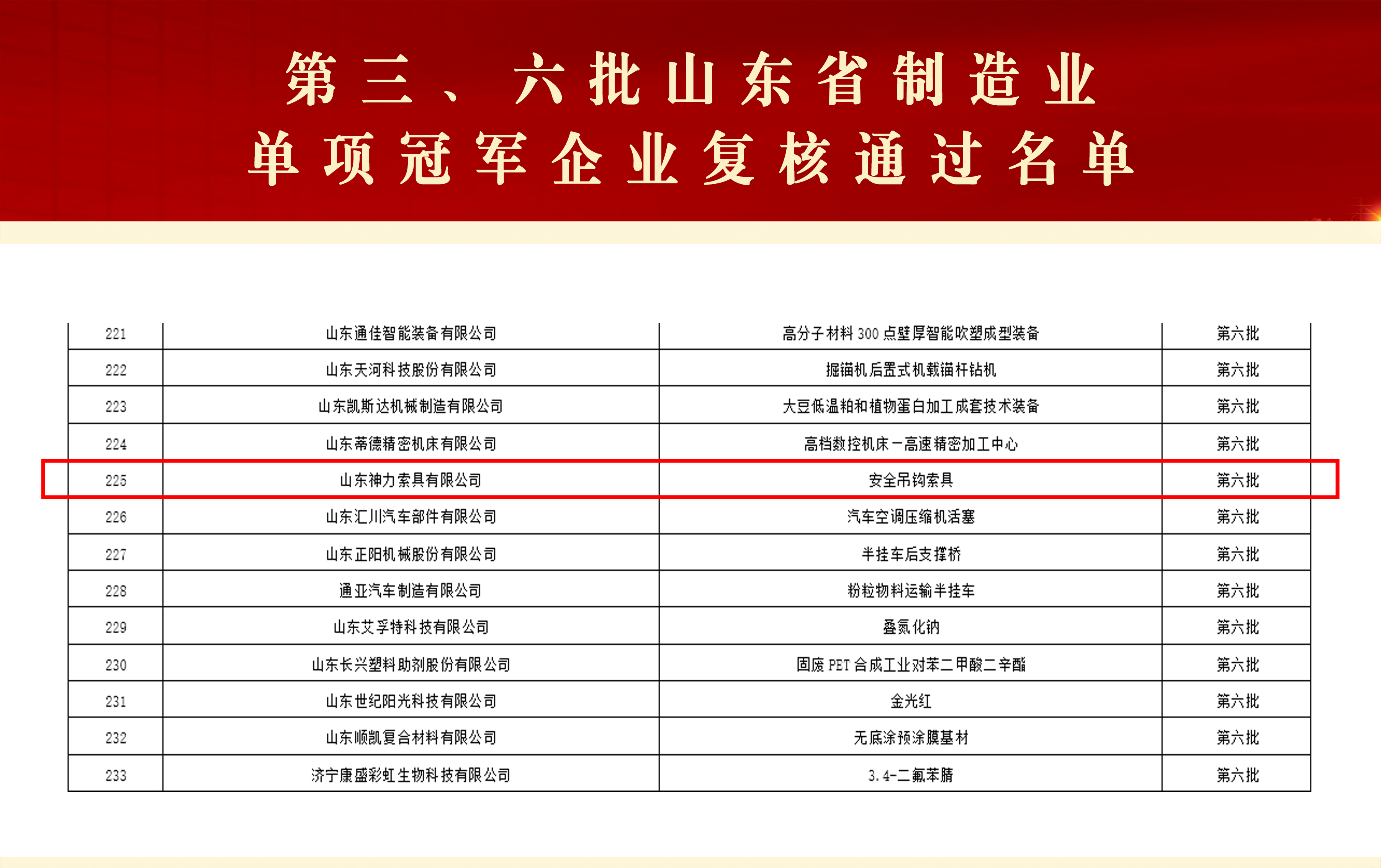 近日,山东省工业和信息化厅正式公布第九批山东省制造业单项冠军企业及通过复核的第三批、第六批企业名单。神力索具凭借在安全吊钩索具领域的产品表现与技术积累,成功通过第六批制造业单项冠军企业复核。