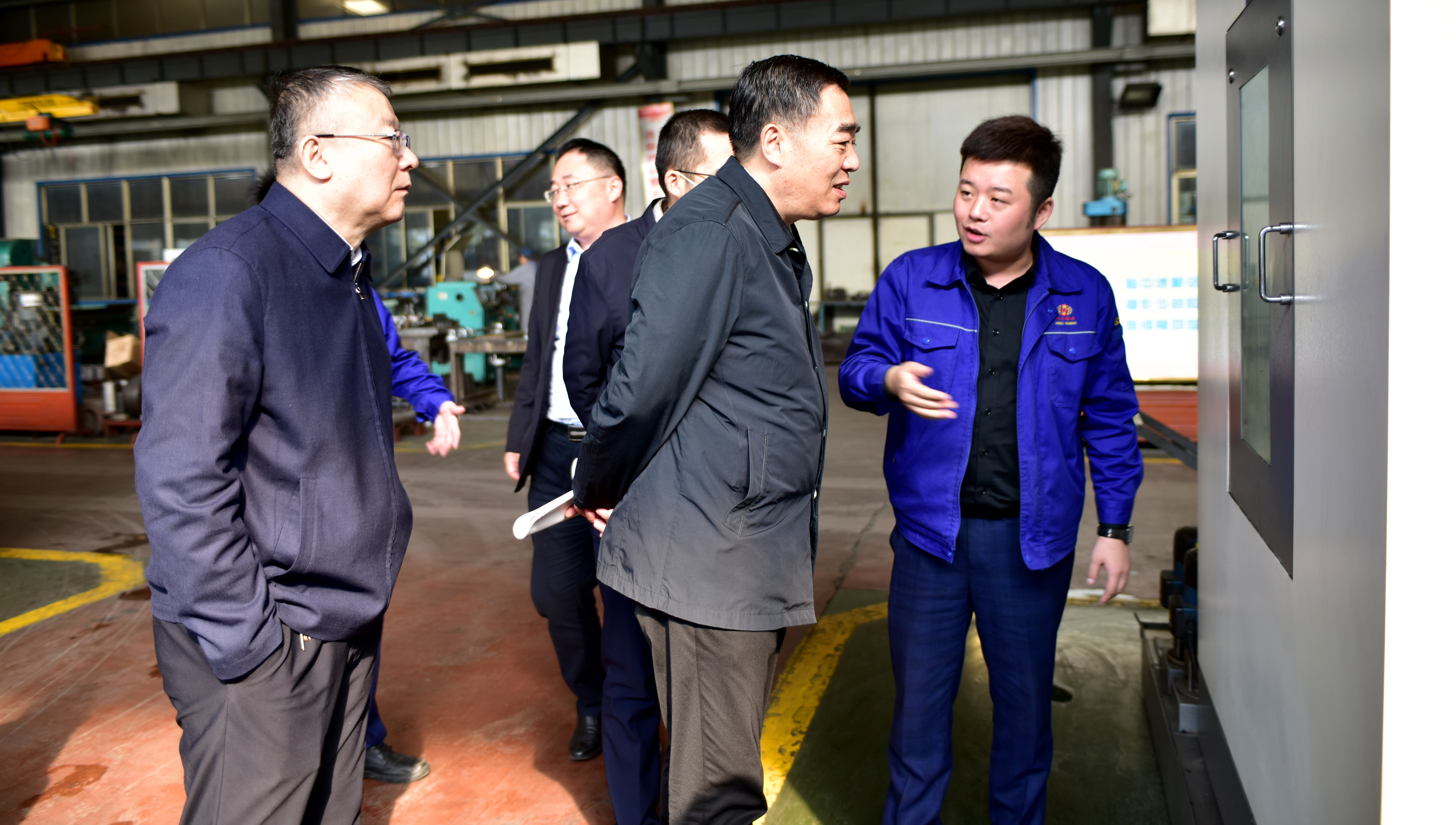 随后,调研组参观了公司样品室,并深入生产车间。在样品室,杜总向大家介绍了公司主导的80级、100级索具产品及其使用领域,并就120级索具产品的研发情况进行了汇报。在生产现场,杜总向调研组详细讲解了生产中使用的智能新设备、锻造新工艺。