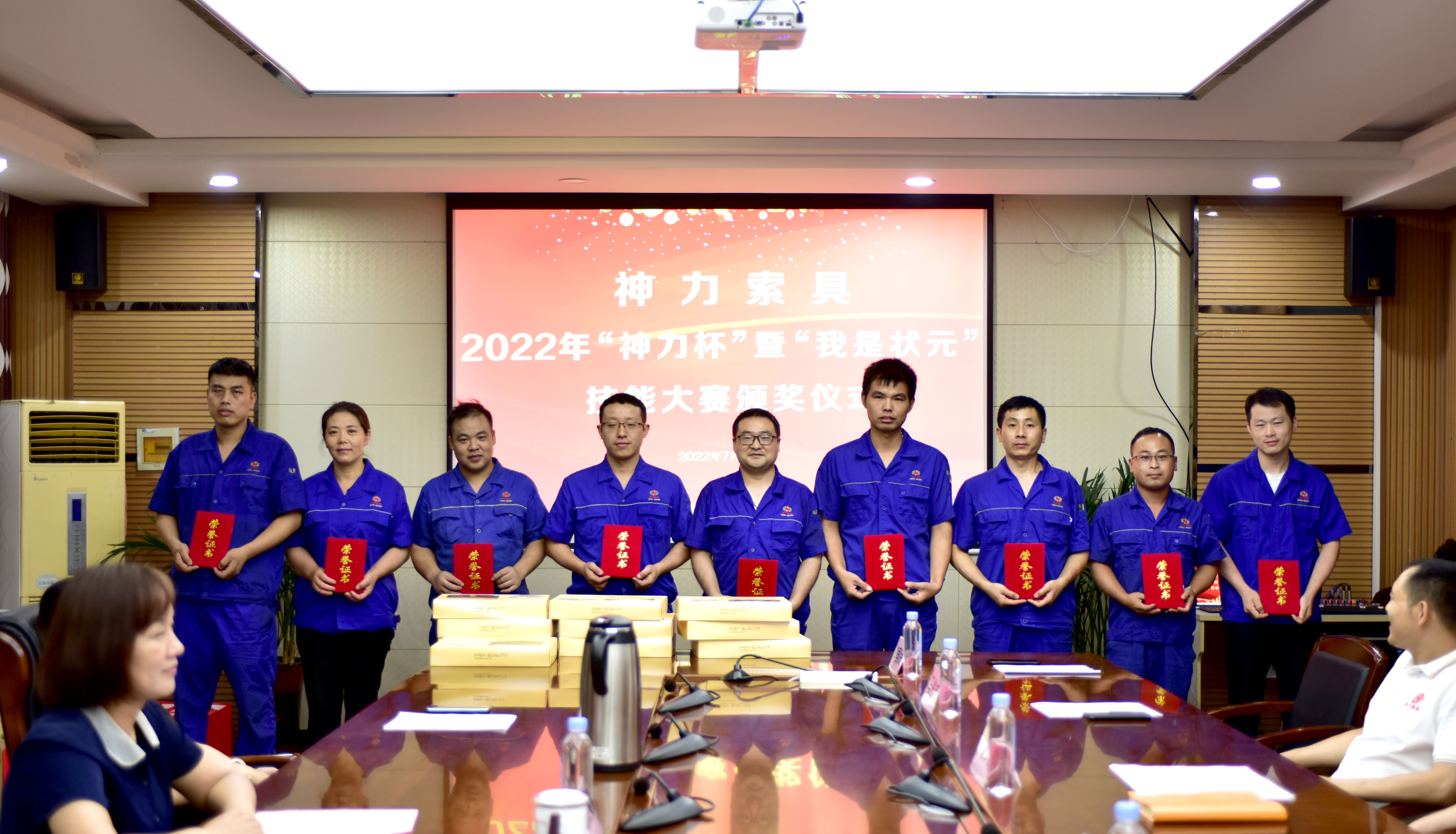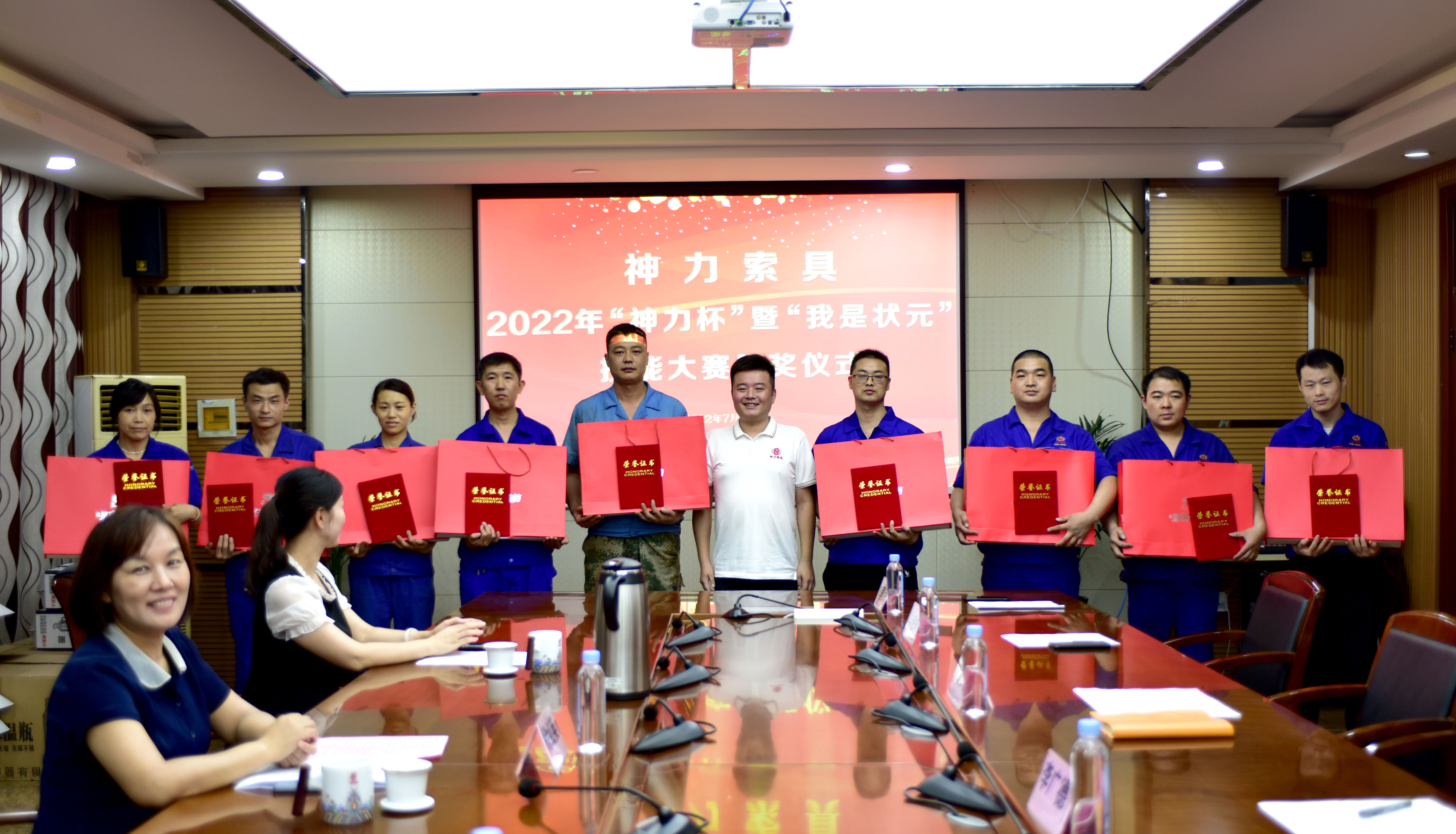 随后,神力索具工会主席李广德同志宣读《2022年度“神力杯”暨“我是状元”职工职业技能大赛获奖人员名单》;并由经开区总工会领导、杜大平总经理、李广德主席分别为获得第一、二、三名的职工颁奖。
