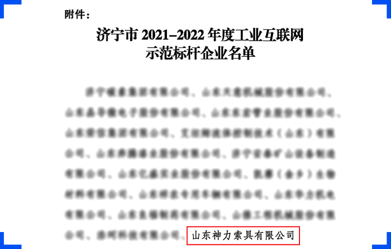 日前,济宁市工业和信息化局发布了《关于公布济宁市2021-2022年度工业互联网示范标杆企业的通知》,经企业申报、专家组实地调研、评审论证、网上公示等程序,32家企业成功入选。其中,神力索具榜上有名,荣获“济宁市2021-2022年度工业互联网示范标杆企业”称号。