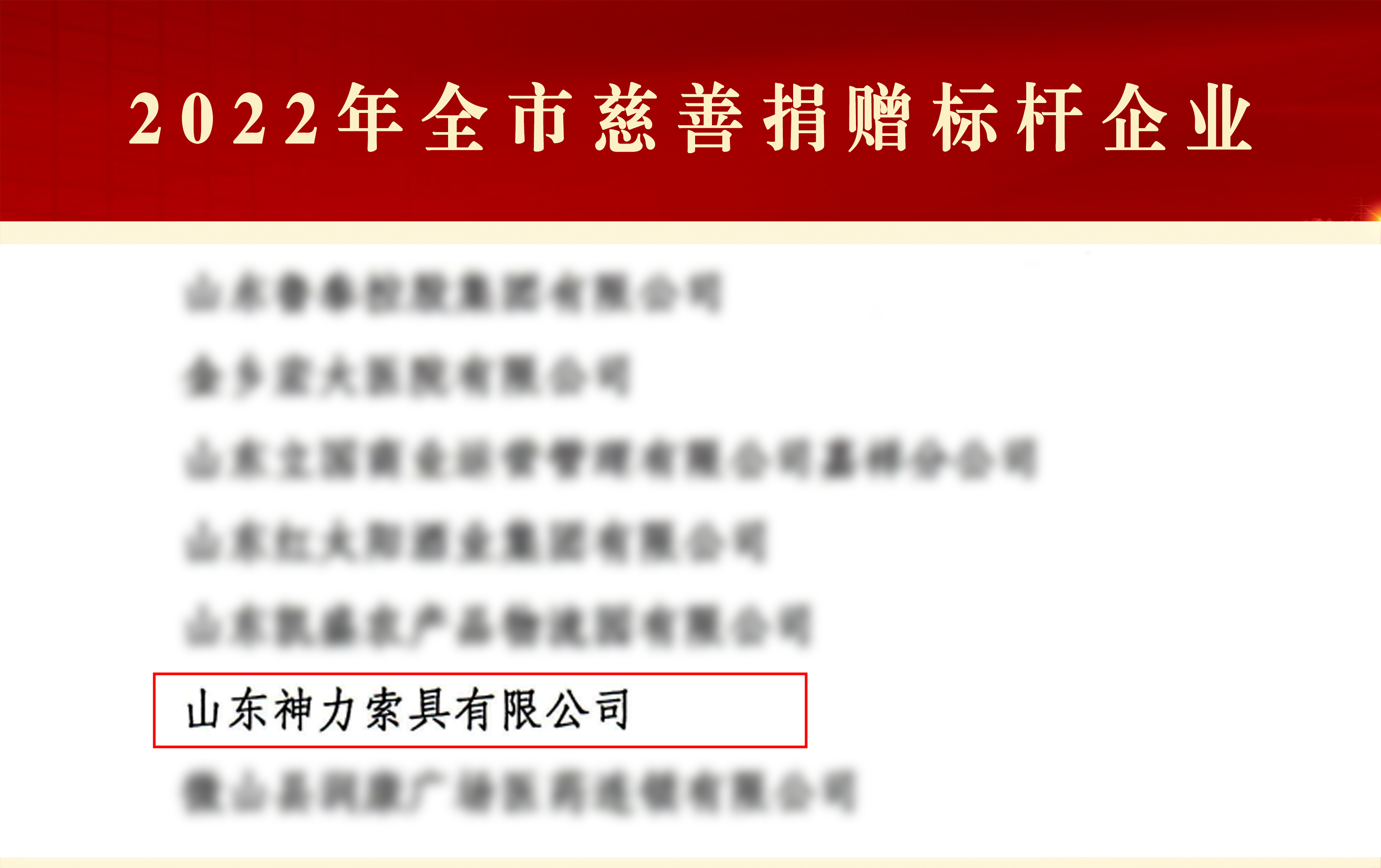 为深入贯彻市委、市政府关于打响“慈润济宁·善行万家”品牌、开展慈善文化“六进”行动部署要求,表扬先进,树立榜样,济宁市慈善总会发布了《关于表扬2022年度全市慈善工作先进集体先进个人的通报》,神力索具荣获“2022年全市慈善捐赠标杆企业”称号。
