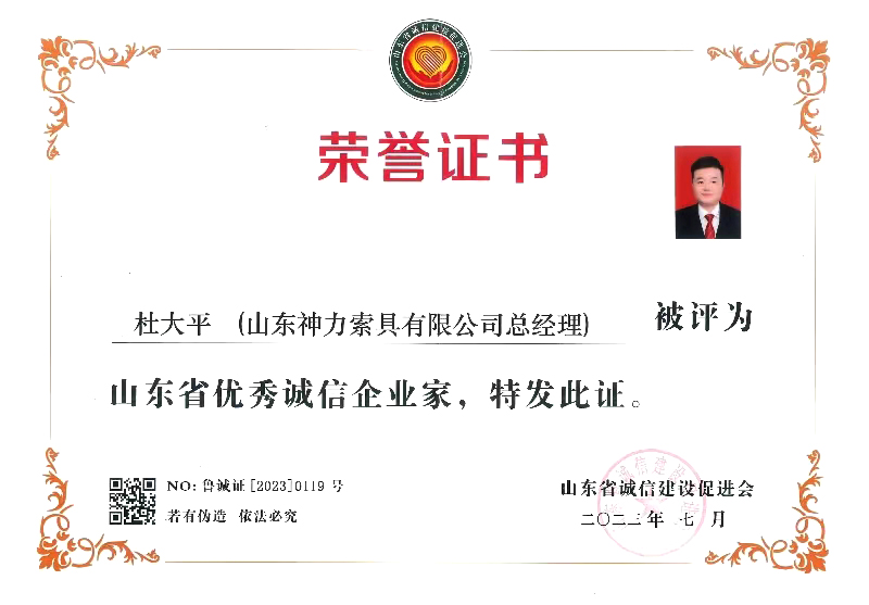 本次会议共通报表彰了全省87家诚信企业、77名优秀诚信企业家、25家诚信建设示范企业和15名诚信建设示范企业领军人物。其中,旺财28APP官方版-旺财28APP最新版-pgwc有限公司荣获“山东省诚信企业”称号,神力索具总经理杜大平荣获“山东省优秀诚信企业家”称号。