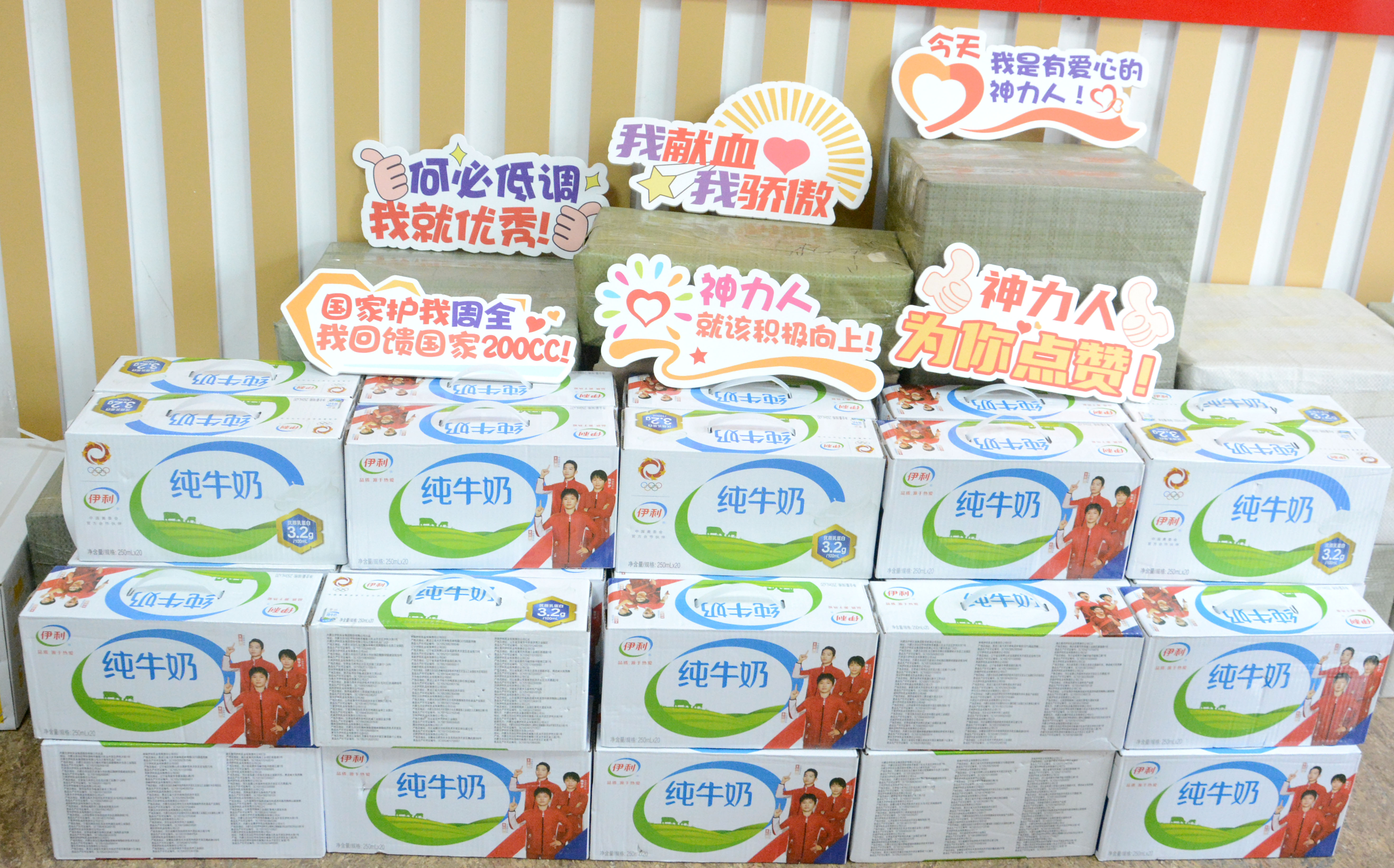 济宁市中心血站为志愿者们送上了纪念品和一本光荣的献血证,公司团委为献血职工送上伊利纯牛奶一箱。