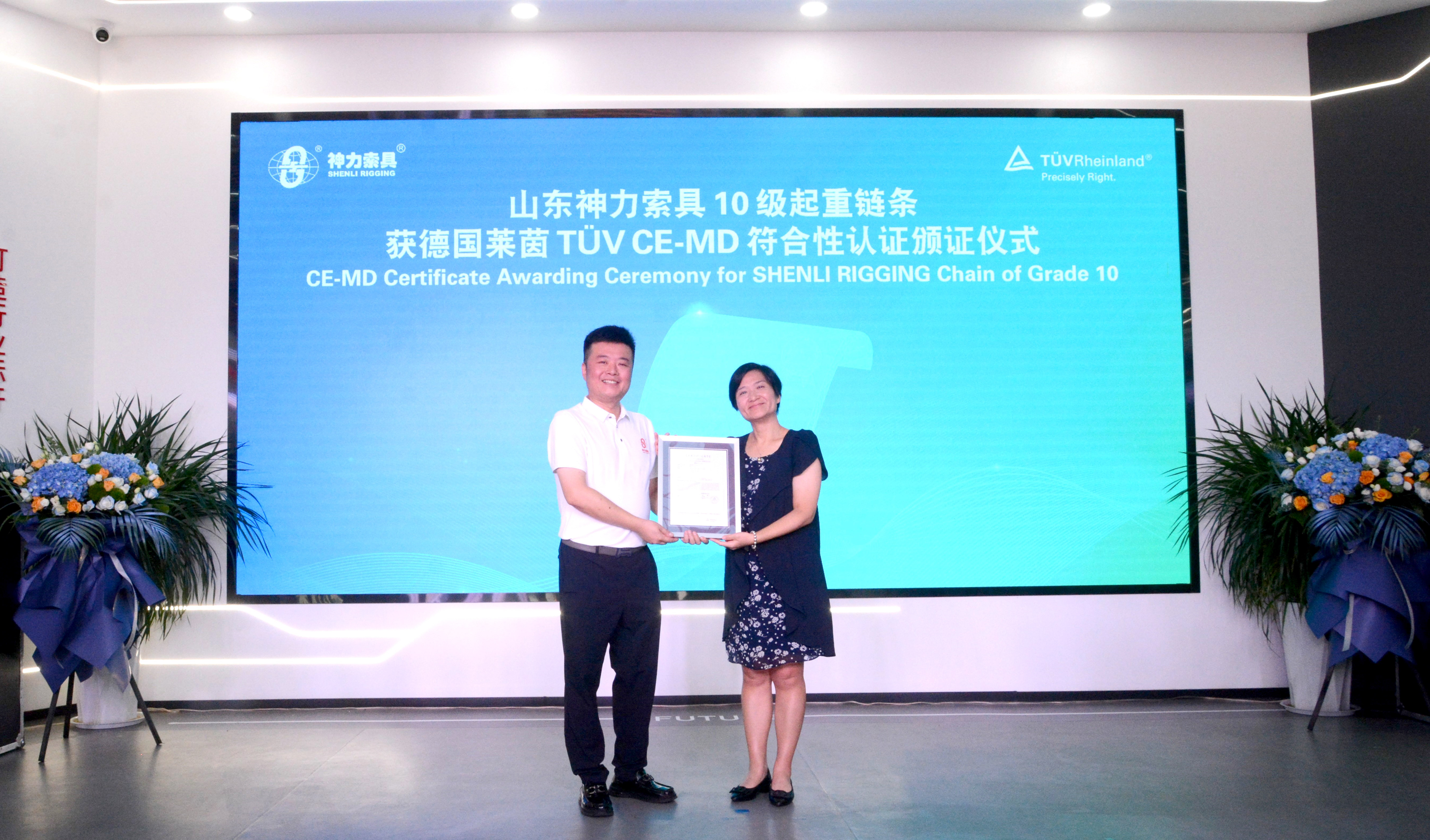 TÜV莱茵是欧盟MD(机械)指令部分产品的公告机构,在索具类产品检测和认证方面拥有丰富经验。10级起重链条作为世界领先的索具产品,载荷相比8级起重链条增加25%,出口欧洲需符合《机械指令2006/42/EC》以及其他相关法令法规。TÜV莱茵青岛的技术团队与德国同事充分沟通,讨论并确认了测试方法。神力索具技术团队针对检测标准,多次试验并修改生产工艺,最终在双方紧密配合下,成功完成此次认证项目。