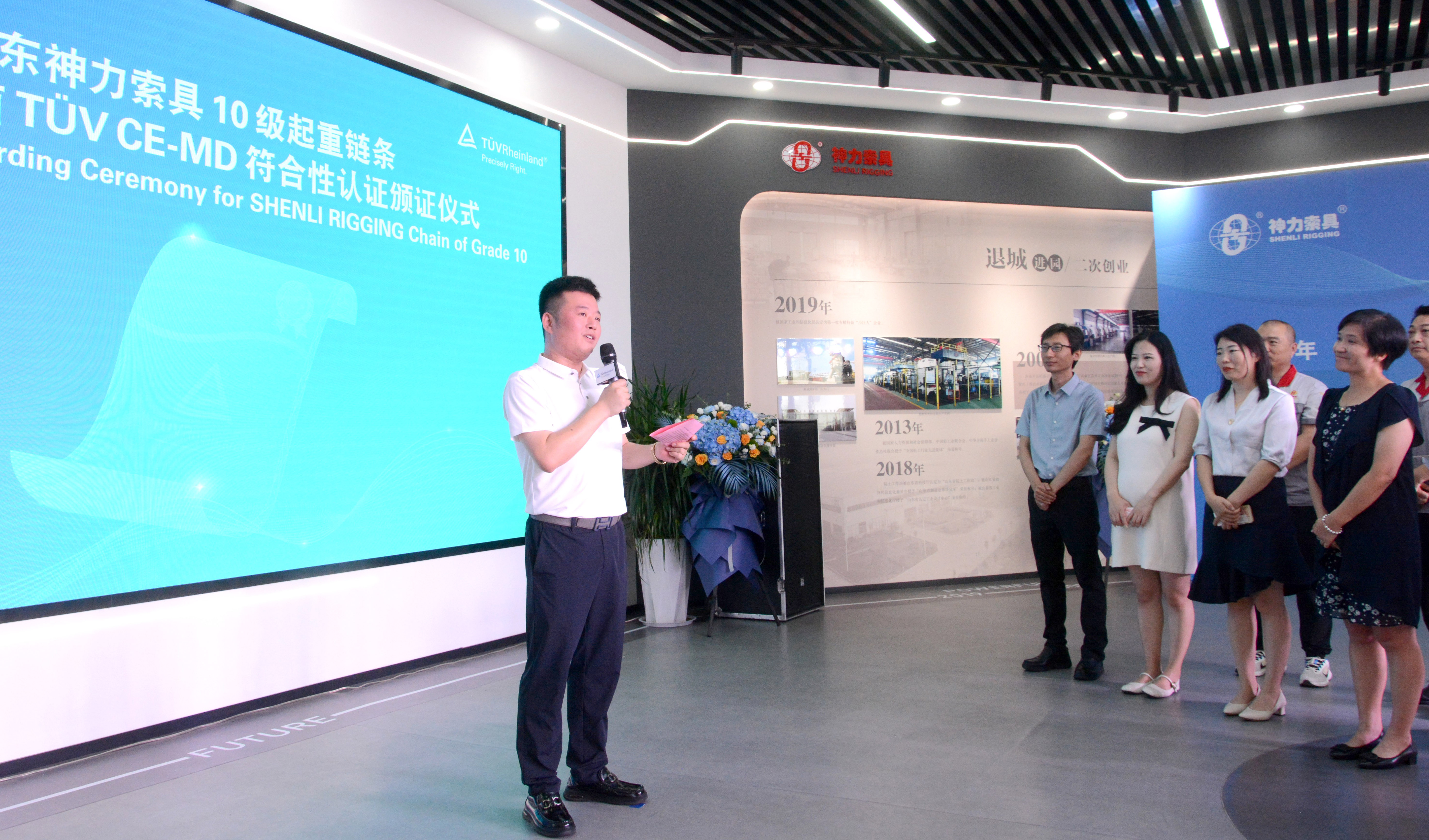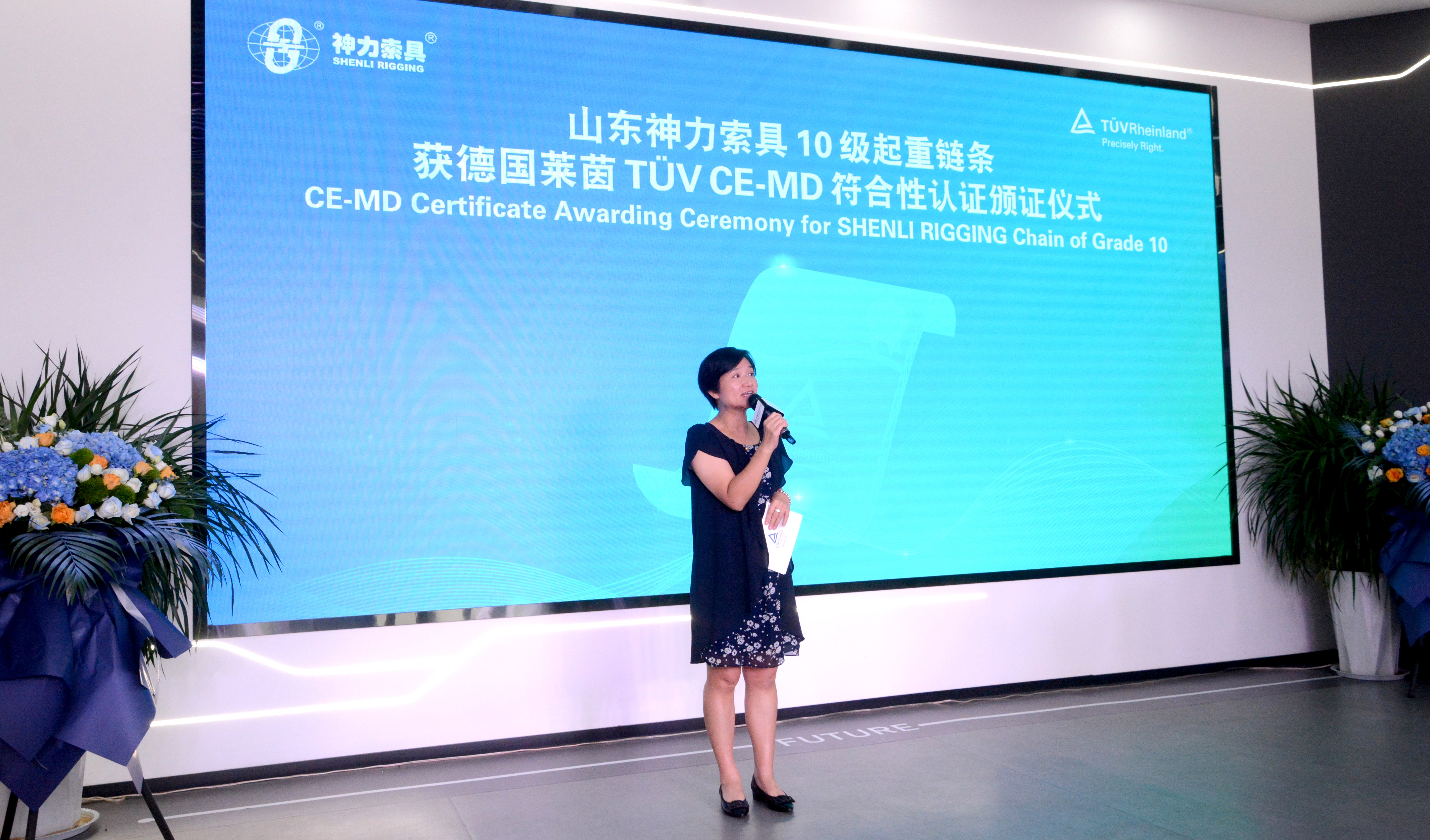 TÜV莱茵代表莱茵大中华区轻工产品服务副总裁熊剑蓉在致辞中表示,此次授牌是莱茵与神力索具合作的全新突破,10级起重链条的符合性认证在欧盟当属首家,莱茵将继续不断探索与神力索具深度合作,向企业低碳生产、高质量发展、转型升级等探索更多全新合作模式,为神力索具提供更全面、更贴合企业发展现状的个性化服务,为企业转型上市、可持续发展探索持续加力,赢得更加广泛长久的合作机会。