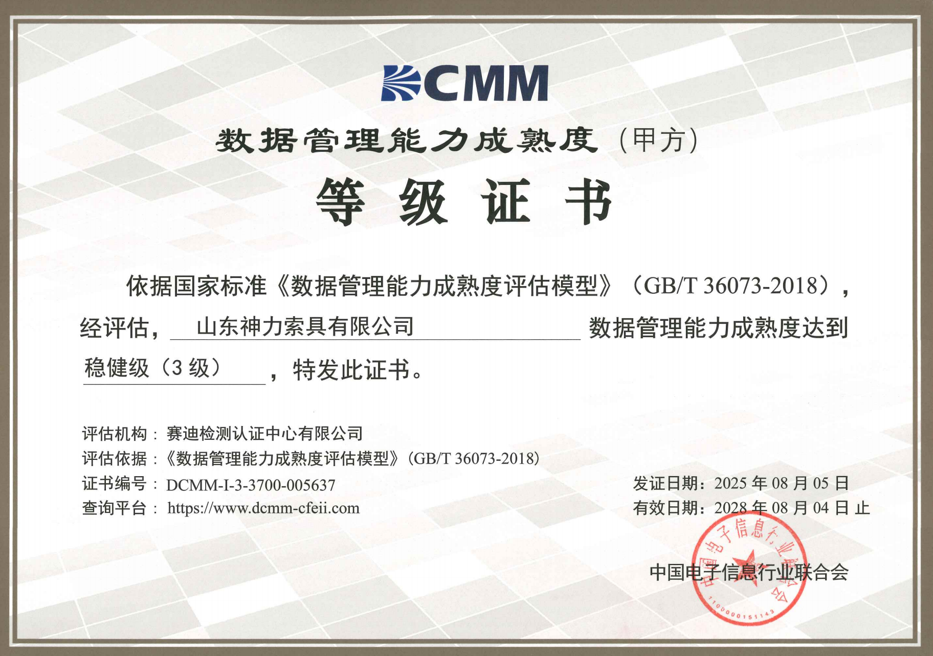 近日,神力索具正式通过赛迪检测认证中心有限公司的严格评估,荣获国家《数据管理能力成熟度(甲方)等级证书》,能力等级达到稳健级(3级)!这是依据国家标准《GB/T36073-2018 数据管理能力成熟度评估模型》进行的权威认证,含金量十足!