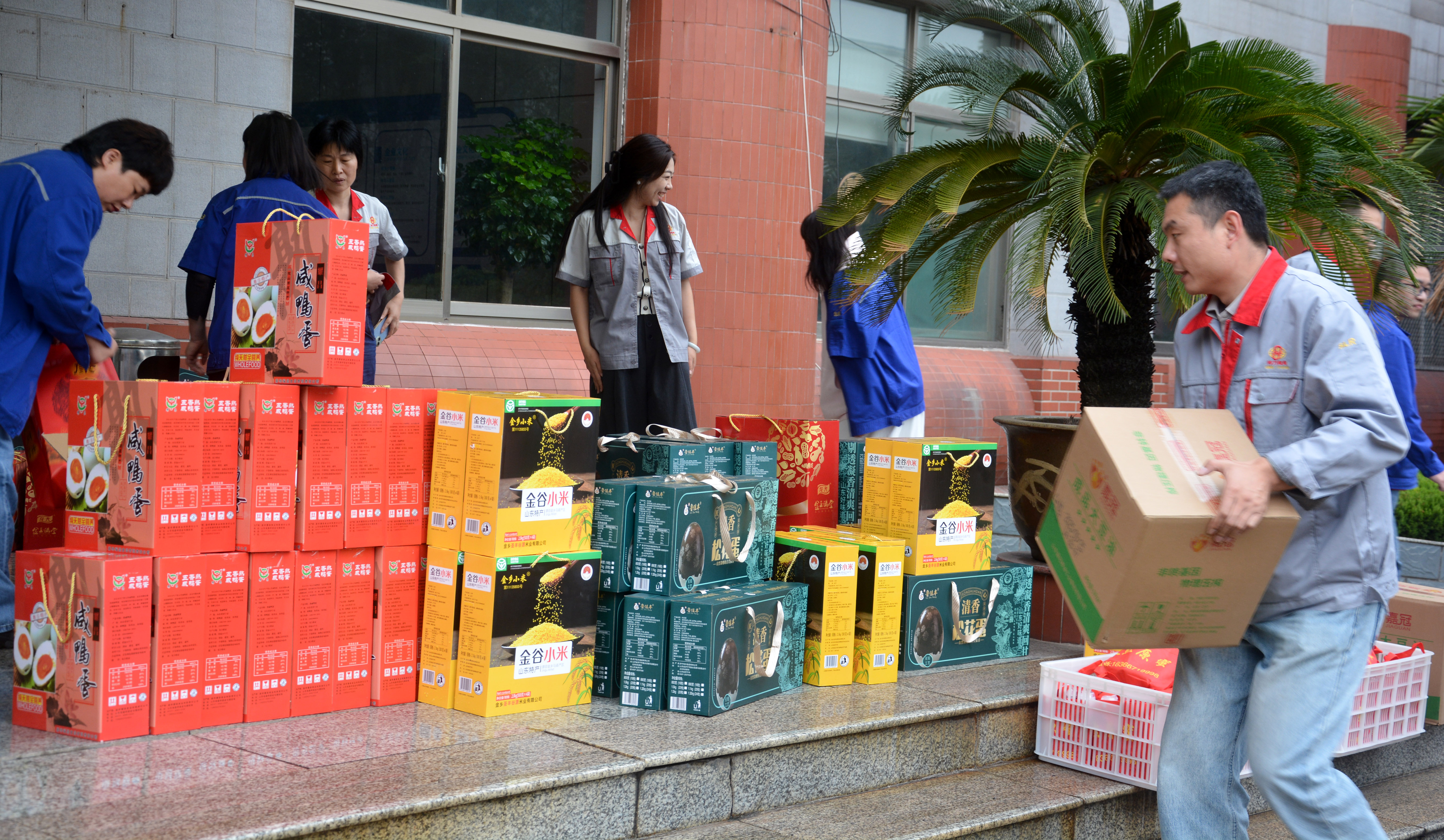福利发放现场,各类精选礼品整齐摆放,涵盖食用油、月饼、大米、小米、松花蛋、咸鸭蛋、蜂蜜等多种日常与节令食品。同事们有序领取,笑容洋溢,处处洋溢着温馨与喜悦的氛围。