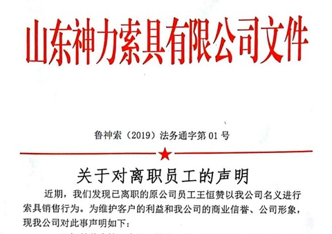 山东审理索具有限公司文件:鲁神索(2019)法务通字第01号 关于对离职员工的声明 近期,旺财28 发现已离职的原公司员工王恒赞以我公司名义进行索具销售行为。为维护客户的利益和我公司的商...